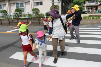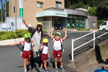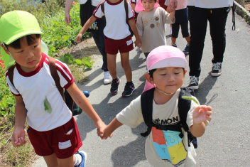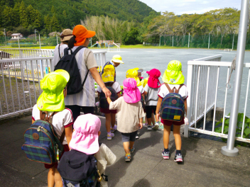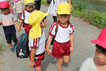 地域探検は楽しかったです!今日は堤防の途中で幼稚園へ