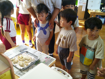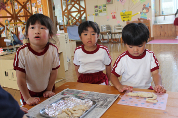 焼き上がりの匂いに誘われて、年少組と満3歳児は様子を見に行きました