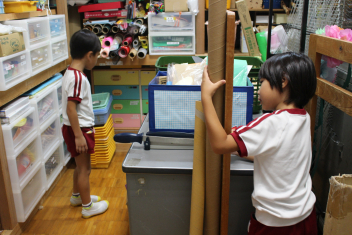 年中組さんは猫の家を大きくするために園長先生と考えていましたよ!