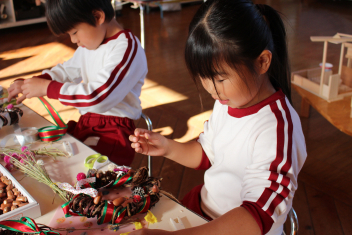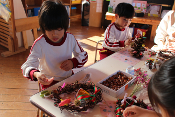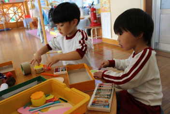はな組、もも組は、顔をかいたり、のりで貼ったりして小人づくり