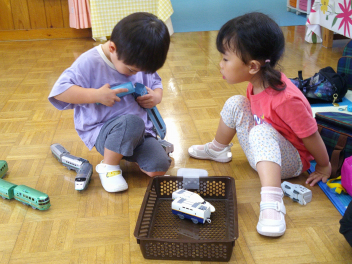 今日は年少と満3歳児は秋の自然物を使って遊びました。