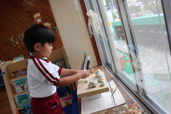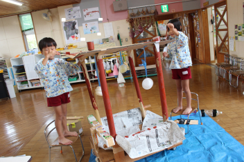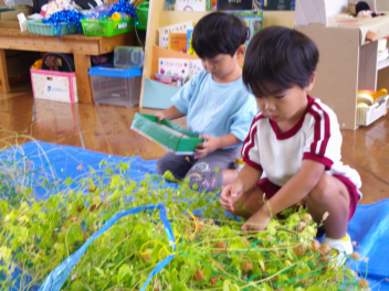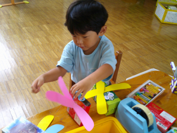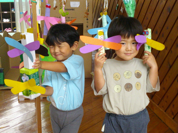 年少・満3歳児は自分でつくったトンボで遊んだり、フウセンカズラの種を