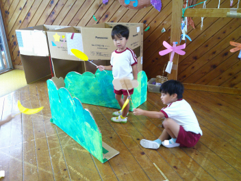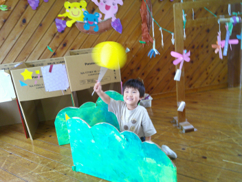 当日は前半は遊びコーナー:年長・年中が考えつくりました!「魚釣り」「恐竜的当て」、