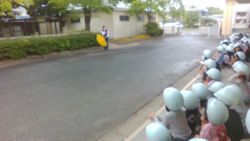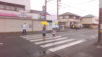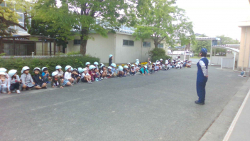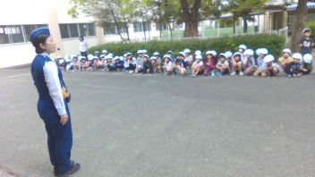 •  小雨が降る中ですが、交通教室が行われました。交通指導員さんから、歩道での歩き方や交差点の安全なわたり方をご指導いただきました。上手な傘のさし方も教えていただきました。
