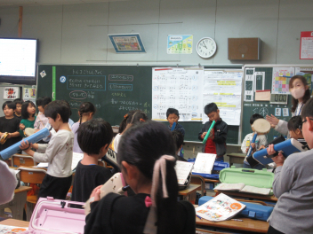 5年生は、20分休みに、にこにこ音楽集会の自主練習をしていました。