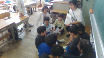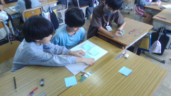 ホワイトボードに、リーダーがグループの子の意見を書き込みながら、真剣に話し合いました。