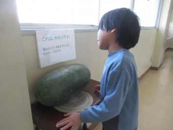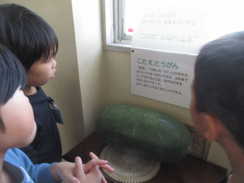 調理されている冬瓜は見たことがあった子は、丸のままの冬瓜を見て驚いていました。smiley