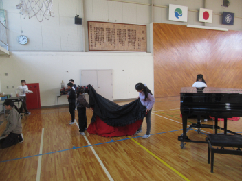 にこにに音楽集会に向けて、楽器、ステージが体育館に運ばれました。