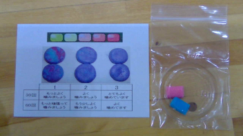 ・2色のガムを噛んで、よく混ぜて噛んでいるか、唾液は出ているかチェック
