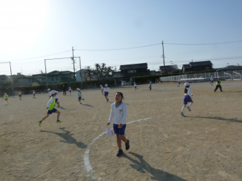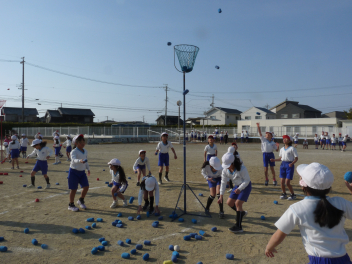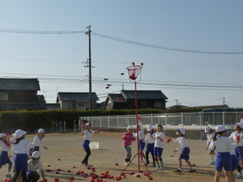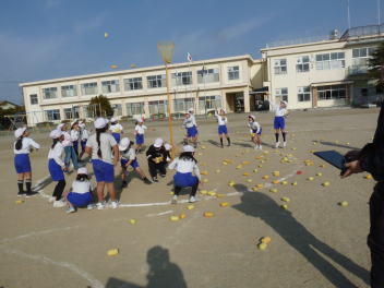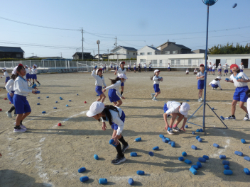スーパー鬼ごっこ、玉入れ、くつとばしの3種目で、学級対抗で競いました。
