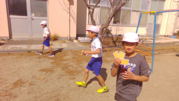 運動場に隠した宝(トランプ)を、どれだけ見つけられるかで競います。すごく盛り上がりました!