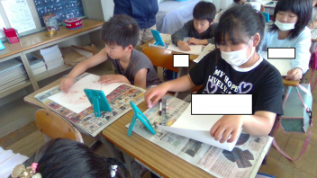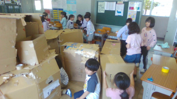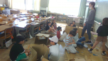 • 2年生みんなで、図工「段ボールに入ってみると」の学習を行いました。