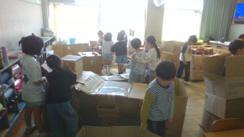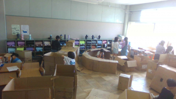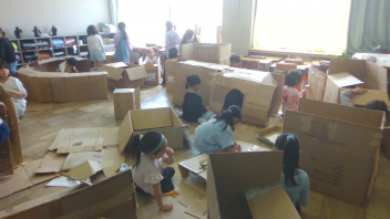 大きさや形がいろいろなたくさんの段ボールを、友達と協力して変身させていきました。