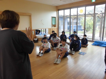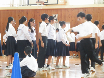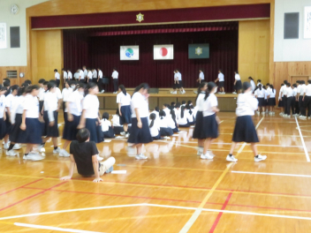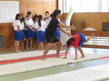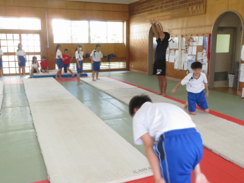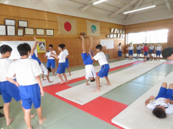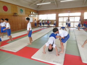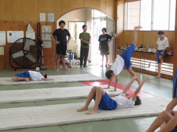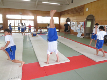 倒立前転や側転など、一人一人が自分の課題をもって練習に取り組んでいました。うまくできた生徒に対して拍手が起きました。指導者は、全体の動きを見ながら、個別に声掛けもしていました。
