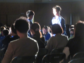 順番を待つ間、生徒たちは他のクラスの合唱に真剣な表情で聞いていました。