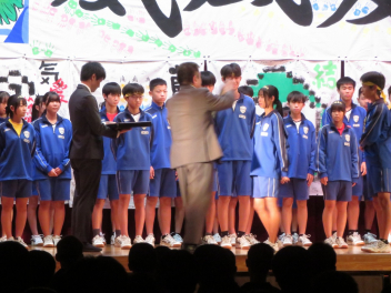 プログラム最後の駅伝壮行会では、暑い夏を乗り越えて成長したメンバーが壇上で抱負を語り、校長先生から代表のたすきを受け取りました。