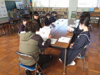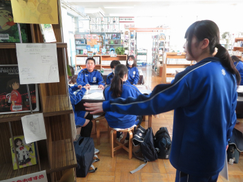 図書室をのぞくと、図書紹介のための本を委員さんたちが相談しながら選んでいました。