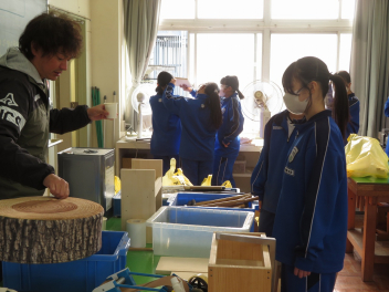 美術科では、石を彫って印鑑づくりの細かな作業を黙々と行っていました。