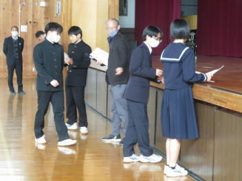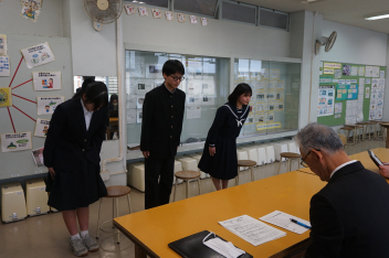 10月に行った生徒総会の議案書にも、執行部や生活委員会の活動内容の中に「あいさつ運動の実施やあいさつの徹底」がうたわれていました。昇降口では、各学年の職員が生徒を迎えていますが、3年生を中心に自分からあいさつをする生徒が増えてきています。毎日の積み重ねが、少しずつ成果に表れているようです。