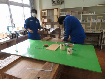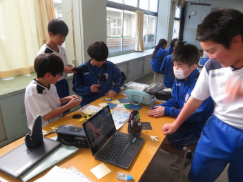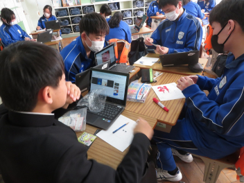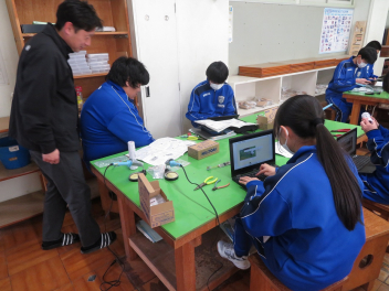 技術科では、タブレットを使い、課題の製作後のまとめを行っていました。