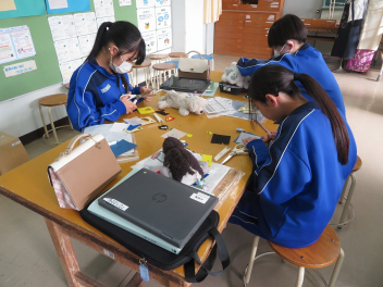 自分で選んだ柄の生地をミシンを使って縫っていました。隣の教室では、発達支援学級の生徒達もミシンを使って小物作りに励んでいました。フエルトを切ってもようを模様を付けたり、はみ出た糸くずを切り取ったりしながら、徐々に仕上げています。