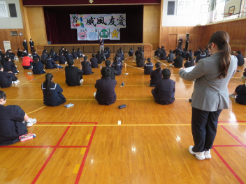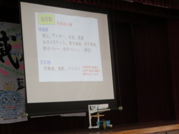 冒頭で校長先生から、中学生になるにあたり、3つの約束の話があり、そのあと篠原中の学校生活やきまり、行事などを紹介しました。生徒会は手作りスライドで、学校の特色をわかりやすく紹介しました。