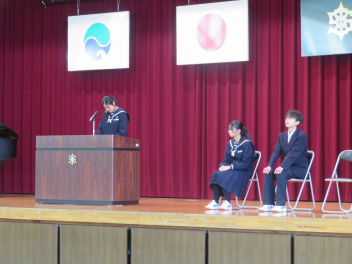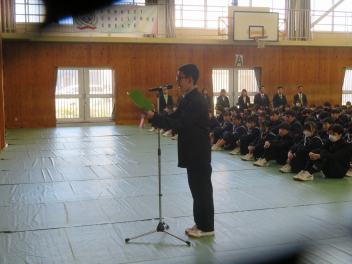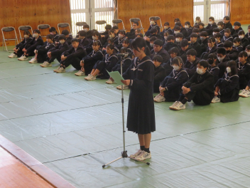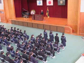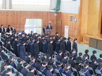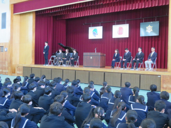 校長先生からは、学校スローガン「3C」をもとに、新2年生、新3年生へ励ましの温かいメッセージが送られました。生徒達は、校長先生からの問いかけに答えながら、これから始まる新しい1年に気持ちを新たにしているようでした。