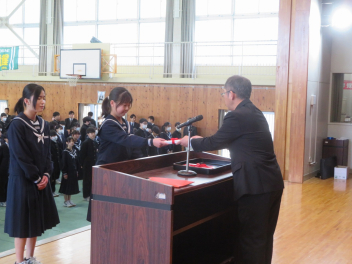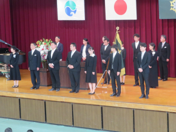 新任の先生方を迎える言葉を発表した芹沢さん、鈴木さん、始業式で抱負を発表した水野さん、本間さん、尾上さん、教科書授与生徒の佐野さん、前澤さん。それぞれが代表として素晴らしい態度で努めました。