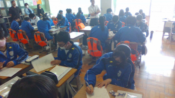今回は大地震に伴う津波避難の訓練です。1年生は中学校での初訓練ですので、避難経路の確認を重点に置きました。