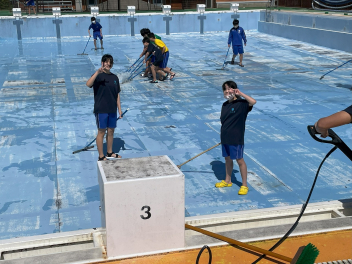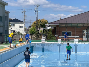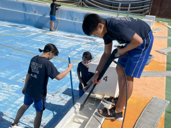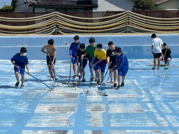 みんながきれいなプールで泳げるような願い、そして自分たちがこれからお世話になる挨拶の思いで、ていねいにこだわって掃除しました。