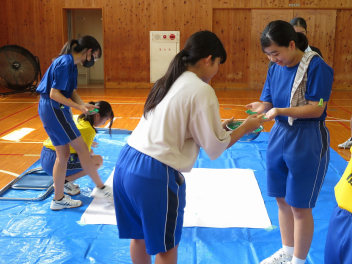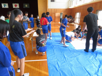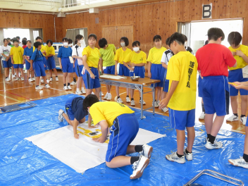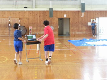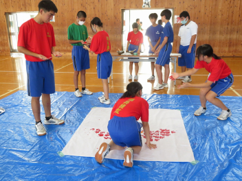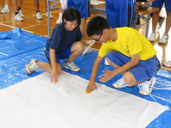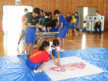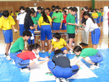 全校生徒が一斉に活動するには暑すぎるので、リモートで各教室をつなぎ、順番に体育館に来て色を付けていきました。各団ごとにタブレットのカメラで制作過程を中継することで、イメージを共有しています。