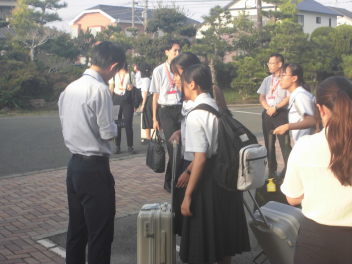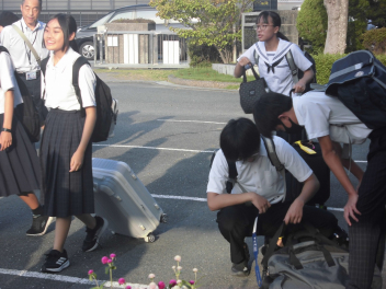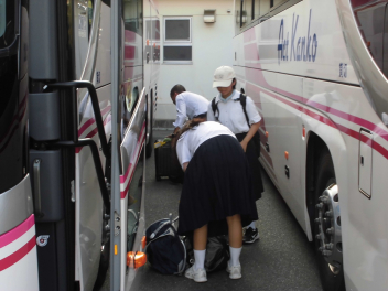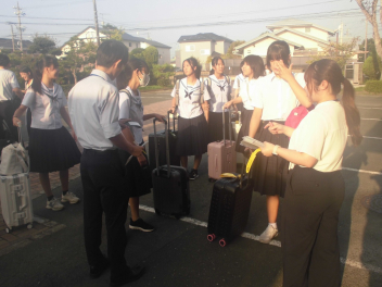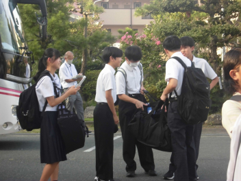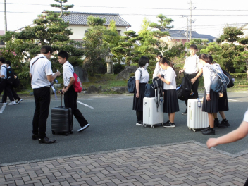 今日から、3年生は修学旅行です。朝早くから大きな荷物を持った生徒たちが次々と集まってきました。