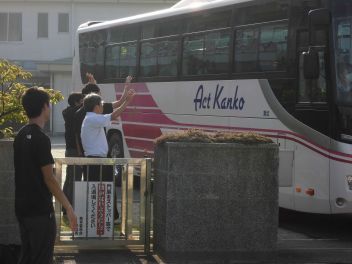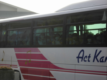 担任から点呼と健康観察を受けて、次々とバスに乗っていきます。互いに楽しそうに話したり、見送りの先生たちに笑顔で話しかけたり、元気な様子がうかがえました。