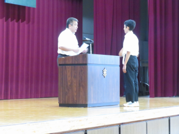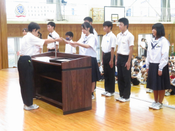 やや緊張した面持ちで、校長先生から任命書を受け取りました。後期のリーダーとして、着実に生徒会活動を進めてくれることを期待しています。何事も一人では成しえないので、まずは仲間づくりを通して協力関係を築いていけるように頑張りましょう。