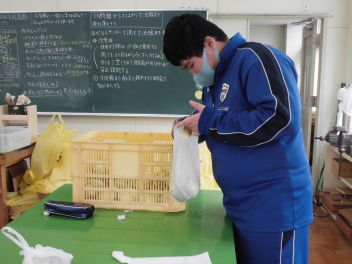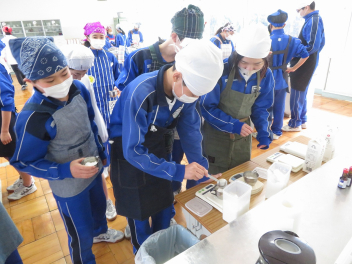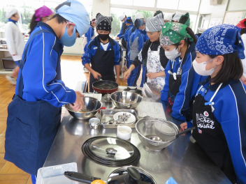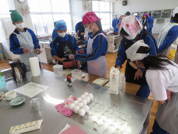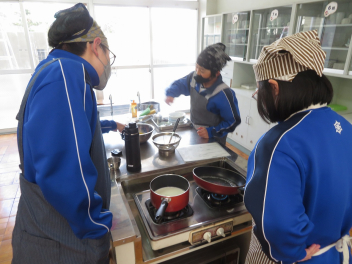 調理室では、1年生がプリン作りに励んでいました。グループの仲間で仕事を分担しながら、協力して作業を進めていました。