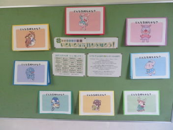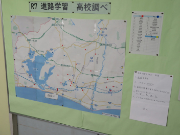 廊下の掲示物からは、生徒たちの学びの様子が読み取れます。