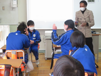 英語科の授業では、アンジェラ先生に続いて、生徒たちの元気な声が響いていました。
