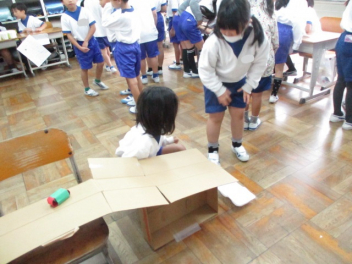 ゴムでっぽうの的当てやコロコロ坂道、磁石を使っためいろ、風の力を利用した車…様々なおもちゃがずらり!1年生は目がキラキラ!2年生は遊び方を一生懸命説明しています。1年生は説明を聞くより、早くやりたくてうずうず。そんなやり取りも微笑ましかったです。あっという間に楽しい時間は終わってしまいましたが、みんな満足そうでした。
