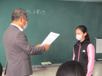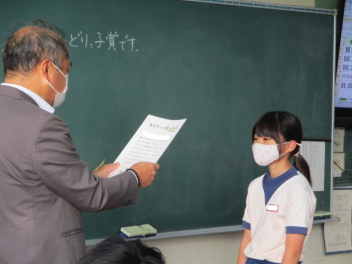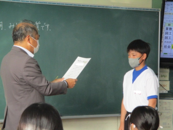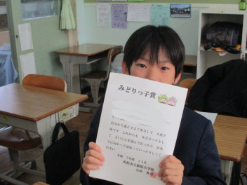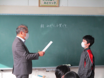 • 5年生「みどりっ子賞」の表彰がありました。最近、高学年としての様々な場面で活躍している姿が見られます。教室でも、互いを思いやったり、真剣に学習に向き合ったり、輝く姿がたくさん見られるようになりました。これからも、自信をもって取り組んでいってほしいものですね。