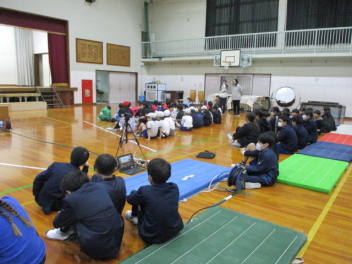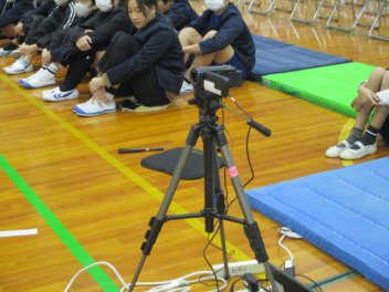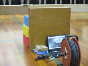 明日の本番、子供たちは半分リモート鑑賞になるため、リモート撮影のための機材もセットされました。舞台全体が見えるようにビデオは体育館中央に、音はしっかり拾えるように集音マイクは舞台に近いところにセッティングしました。実はこの集音マイク、性能がよいので、フロアでひそひそ話している声や足音も拾ってしまいます。子供たちには、静かに黙って鑑賞できるように指導をしました。保護者の皆様も御協力をお願いします。