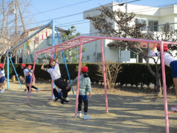 人数確認をすると所在不明の児童が2名います。今回は2名の児童に協力してもらい、けがをしたり怖くなったりして動けなくなってしまったという想定で訓練を行いました。職員が手分けして不明者を捜索し、無事に全員の安全が確保できました。