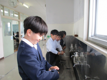 •  正門前にあった横断歩道が交差点付近に移設されました。昨日、今日と、子供たちが安全に通行できるよう、登下校時に職員が見守りました。