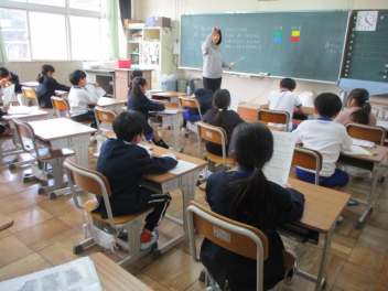 •  5年生が外国語活動でALTの先生とクイズをしていました。答えをランキング形式で5つ示し、1位から順にポイントがもらえるようです。