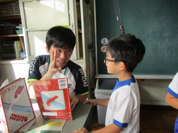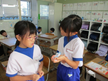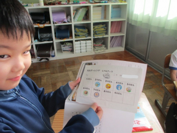 2年生が「かけ算九九」の暗記に挑戦しています。友達と聞き合ったり、九九カードで練習したりして、自信がつくと先生にチェックしてもらいます。合格したら、自分で好きなシールを選んで貼っています。2学期中に9の段までクリアできるといいですね。