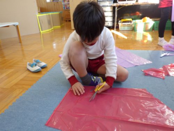 カラーポリ袋を上手に切ってるね