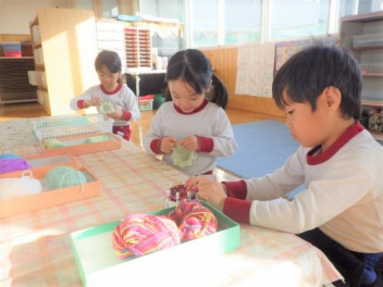 色とりどりの毛糸で熱心に何やってるの?
