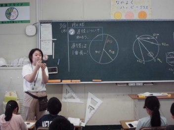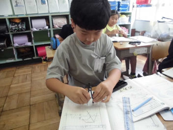 新津小の3年生の子供たちは、算数「円と球」の学習をしています。今日は、コンパスの使い方を練習します。