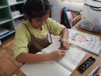 「みなさん、コンパスに名前が書けましたね。」「ノートに書いてみますよ。」