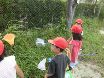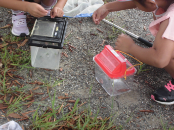 新津小の1年生の子供たちは、生活「いきもとのなかよし」の学習で、新津の森や小運動場で虫探しをしました。