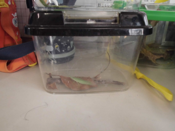 見つけた虫を虫かごに入れて、虫のために葉っぱや草を入れてあげました。